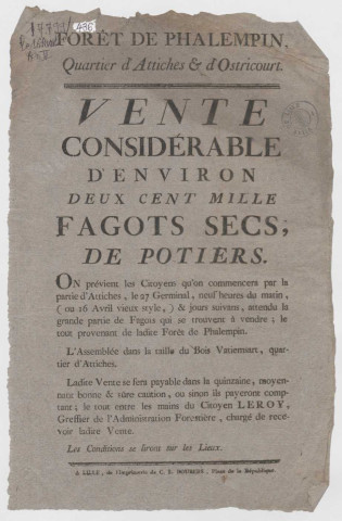Forêt de Phalempin. Quartier d'Attiches et d'Ostricourt. Vente considérable d'environ 200000 fagots secs de potiers.