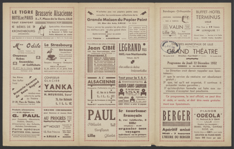 Le fonds présente également un historique du théâtre Lequeux (détruit par un incendie en 1903), ainsi que quelques programmes de représentations données au Grand théâtre de Roubaix et au Théâtre municipal de Tourcoing.