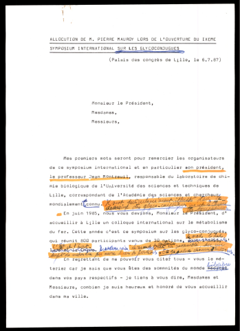 discours, invitations, coupures de presse, correspondance.