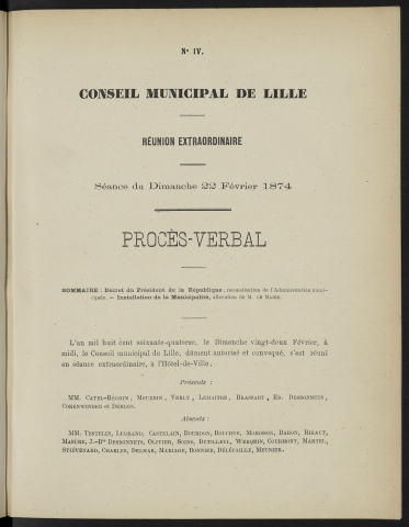 Les Archives municipales de Lille conservent les procès-verbaux de séances à partir du 20 février 1790. Ils sont manuscrits jusqu'au 29 Novembre 1873 puis imprimés.