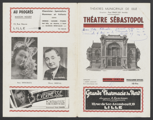 Le fonds présente également un historique du théâtre Lequeux (détruit par un incendie en 1903), ainsi que quelques programmes de représentations données au Grand théâtre de Roubaix et au Théâtre municipal de Tourcoing.