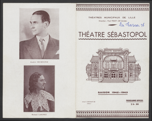 Le fonds présente également un historique du théâtre Lequeux (détruit par un incendie en 1903), ainsi que quelques programmes de représentations données au Grand théâtre de Roubaix et au Théâtre municipal de Tourcoing.