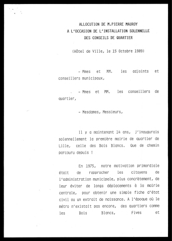 discours, compte-rendu de séance plénière de conseil de quartier, coupures de presse.
